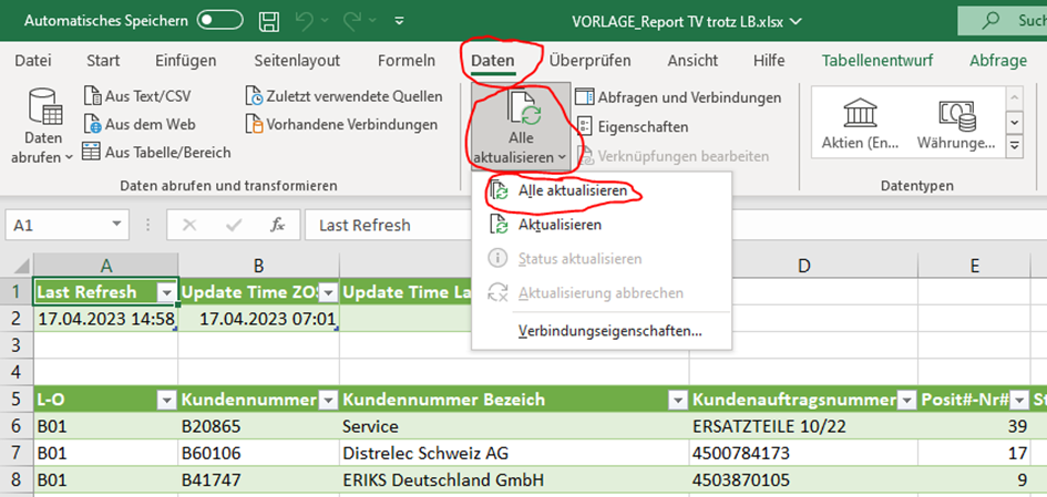 2. Klick in der Menüleiste auf „Daten“, anschließend auf „Alle aktualisieren“ und abschließend erneut auf „Alle aktualisieren“