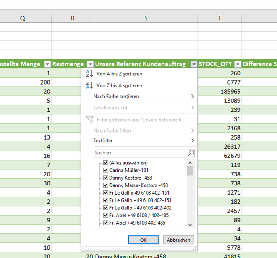 7. Durch die Filterung in Spalte S kann sich jeder seine eigenen Vorgänge selektieren. Für die Bearbeitung der Vorgänge, welche nicht personalisiert sind, sondern auf das jeweilige Team laufen (Nord, Mitte, Süd, KC, SC, STC und VTP), ist sich innerhalb der Gruppe abzustimmen